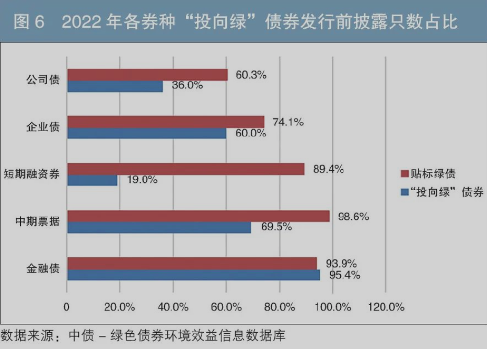 從綠債環(huán)境效益信息披露情況看,《報告》指出,參考中債綠色指標(biāo)體系,根據(jù)中債-綠色債券環(huán)境效益信息數(shù)據(jù)庫(以下簡稱“中債綠債數(shù)據(jù)庫”)的綠債發(fā)行前環(huán)境效益信息數(shù)據(jù)統(tǒng)計,2022年我國公開發(fā)行“投向綠”債券964只,在發(fā)行前階段披露環(huán)境效益信息的有514只,披露只數(shù)占比為53.3%。公開發(fā)行貼標(biāo)綠債391只,在發(fā)行前階段披露環(huán)境效益信息的有331只,披露只數(shù)占比為84.7%。在“投向綠”債券中,金融債的披露只數(shù)占比最高,達(dá)95%;中期票據(jù)、企業(yè)債券次之,披露只數(shù)占比均超過60%。在貼標(biāo)綠債中,中期票據(jù)、金融債、短期融資券披露環(huán)境效益的只數(shù)占比較高,均達(dá)到90%左右。