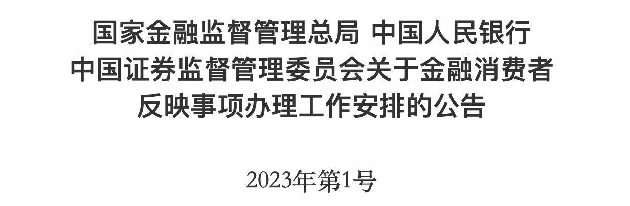 6月2日,國(guó)家金融監(jiān)督管理總局網(wǎng)站發(fā)布其揭牌后的“1號(hào)文”,其與中國(guó)人民銀行、中國(guó)證券監(jiān)督管理委員會(huì)聯(lián)合發(fā)布《關(guān)于金融消費(fèi)者反映事項(xiàng)辦理工作安排的公告》(下稱《公告》)。