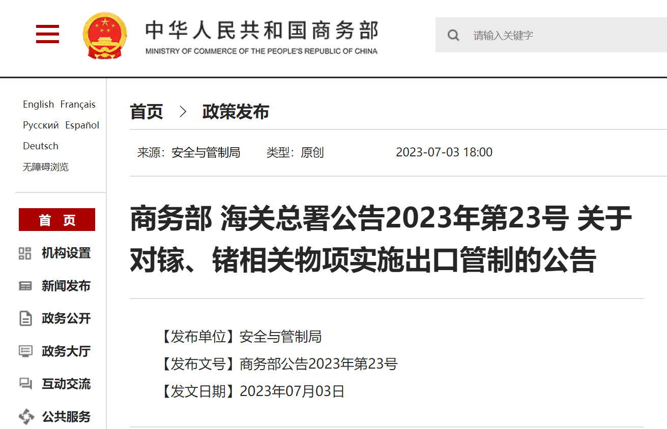 據(jù)商務(wù)部網(wǎng)站7月3日消息,商務(wù)部、海關(guān)總署發(fā)布《關(guān)于對(duì)鎵、鍺相關(guān)物項(xiàng)實(shí)施出口管制的公告》(以下簡(jiǎn)稱《公告》)。