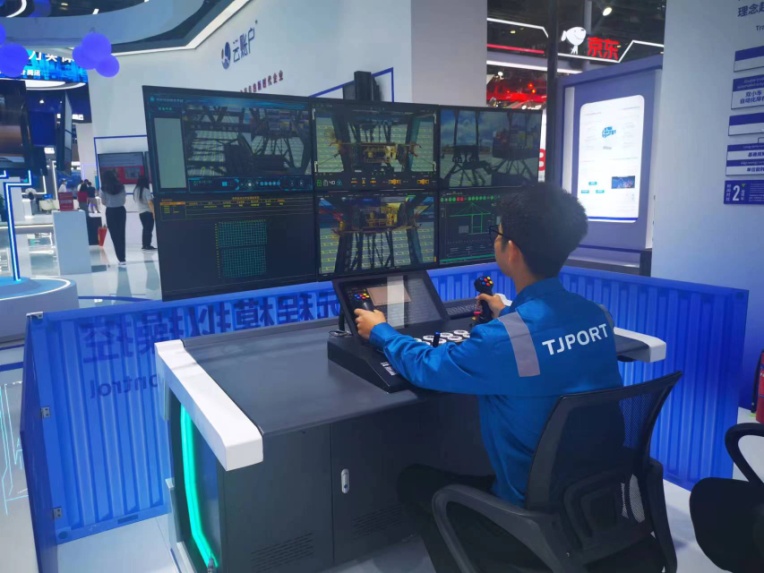 在天津港展臺(tái),一位工作人員正在操控一臺(tái)虛擬港口堆場(chǎng)集裝箱裝卸作業(yè)設(shè)備。工作人員向記者介紹,天津港正在致力于實(shí)現(xiàn)碼頭作業(yè)的完全自動(dòng)化,在與通信技術(shù)、人工智能和自動(dòng)駕駛等領(lǐng)域的科技公司合作下,智能集裝箱碼頭已經(jīng)實(shí)現(xiàn)無(wú)人作業(yè),堆場(chǎng)內(nèi)無(wú)人駕駛卡車可以根據(jù)北斗導(dǎo)航指引,自動(dòng)實(shí)現(xiàn)裝卸貨的操作。