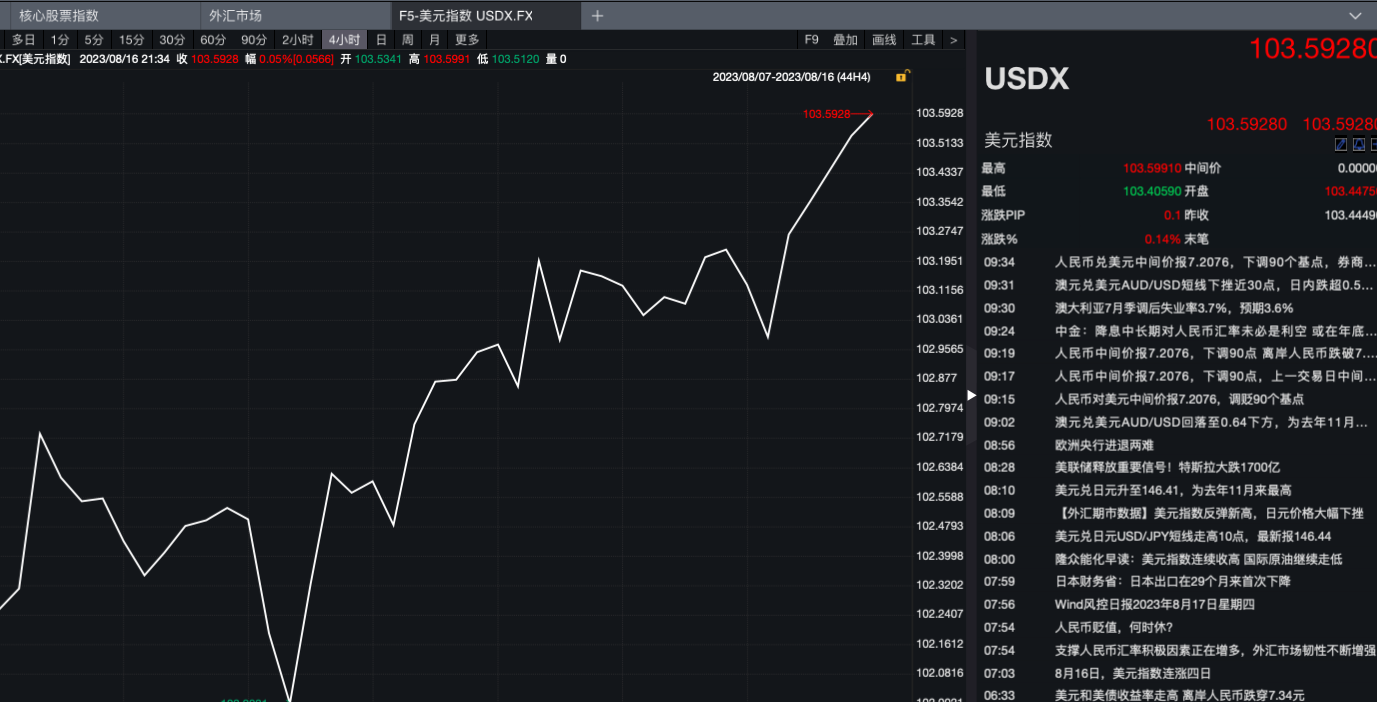 在紀(jì)要發(fā)布的當(dāng)日,美股三大指數(shù)全線收跌。其中納指連續(xù)第三個(gè)交易日跌超1%,截至收盤,納指跌1.15%、道指跌0.52%、標(biāo)普500指數(shù)跌0.76%。美元指數(shù)則繼續(xù)上行,在“103”關(guān)口上方不斷沖高,盤中最高觸達(dá)103.5991點(diǎn)。