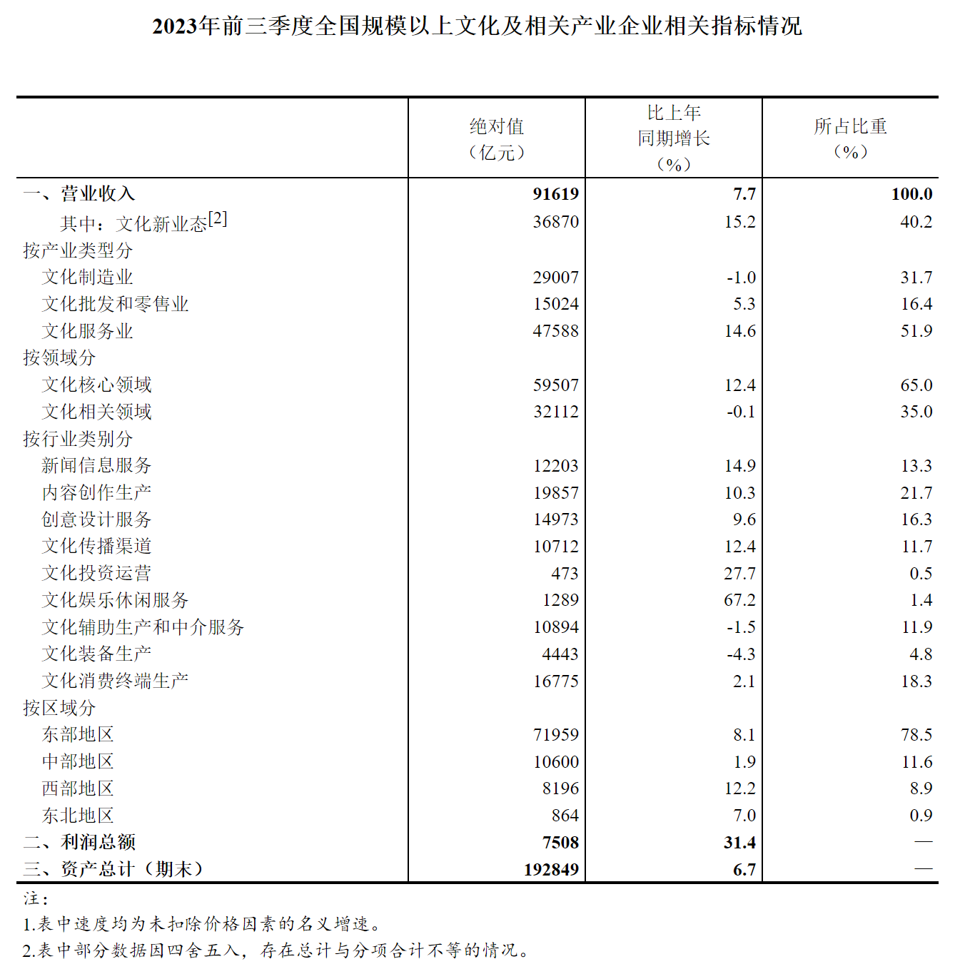 10月30日,國(guó)家統(tǒng)計(jì)局發(fā)布數(shù)據(jù),據(jù)對(duì)全國(guó)7.2萬(wàn)家規(guī)模以上文化及相關(guān)產(chǎn)業(yè)企業(yè)(以下簡(jiǎn)稱“文化企業(yè)”)調(diào)查,2023年前三季度,文化企業(yè)實(shí)現(xiàn)營(yíng)業(yè)收入91619億元,按可比口徑計(jì)算,比上年同期增長(zhǎng)7.7%。其中,文化新業(yè)態(tài)特征較為明顯的16個(gè)行業(yè)小類實(shí)現(xiàn)營(yíng)業(yè)收入36870億元,比上年同期增長(zhǎng)15.2%,快于全部規(guī)模以上文化企業(yè)7.5個(gè)百分點(diǎn)。