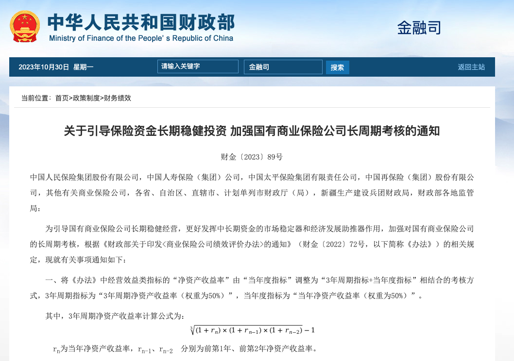 為引導(dǎo)國(guó)有商業(yè)保險(xiǎn)公司長(zhǎng)期穩(wěn)健經(jīng)營(yíng),更好發(fā)揮中長(zhǎng)期資金的市場(chǎng)穩(wěn)定器和經(jīng)濟(jì)發(fā)展助推器作用,加強(qiáng)對(duì)國(guó)有商業(yè)保險(xiǎn)公司的長(zhǎng)周期考核,財(cái)政部網(wǎng)站10月30日發(fā)布《關(guān)于引導(dǎo)保險(xiǎn)資金長(zhǎng)期穩(wěn)健投資加強(qiáng)國(guó)有商業(yè)保險(xiǎn)公司長(zhǎng)周期考核的通知》(以下簡(jiǎn)稱《通知》)。