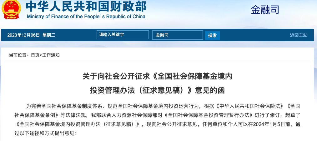 據(jù)財政部網(wǎng)站12月6日消息,為完善全國社會保障基金制度體系、規(guī)范全國社會保障基金境內(nèi)投資運營行為,根據(jù)《中華人民共和國社會保險法》《全國社會保障基金條例》等法律法規(guī),財政部聯(lián)合人力資源社會保障部對《全國社會保障基金投資管理暫行辦法》進行了修訂,起草了《全國社會保障基金境內(nèi)投資管理辦法(征求意見稿)》(以下簡稱《管理辦法》)。現(xiàn)向社會公開征求意見。
