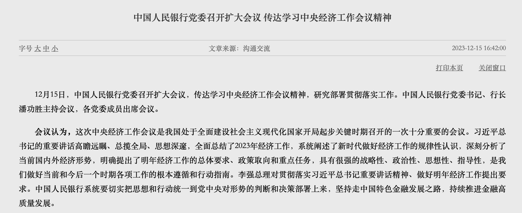 12月15日,中國(guó)人民銀行黨委召開(kāi)擴(kuò)大會(huì)議,傳達(dá)學(xué)習(xí)中央經(jīng)濟(jì)工作會(huì)議精神,研究部署貫徹落實(shí)工作。會(huì)議強(qiáng)調(diào),做好明年的經(jīng)濟(jì)金融工作,要堅(jiān)持穩(wěn)中求進(jìn)工作總基調(diào),完整、準(zhǔn)確、全面貫徹新發(fā)展理念,加大宏觀調(diào)控力度,保持貨幣政策的穩(wěn)健性,防范化解金融風(fēng)險(xiǎn),深化金融改革開(kāi)放,切實(shí)增強(qiáng)經(jīng)濟(jì)活力,改善社會(huì)預(yù)期,鞏固和增強(qiáng)經(jīng)濟(jì)回升向好態(tài)勢(shì),持續(xù)推動(dòng)經(jīng)濟(jì)實(shí)現(xiàn)質(zhì)的有效提升和量的合理增長(zhǎng)。著重抓好以下工作任務(wù):