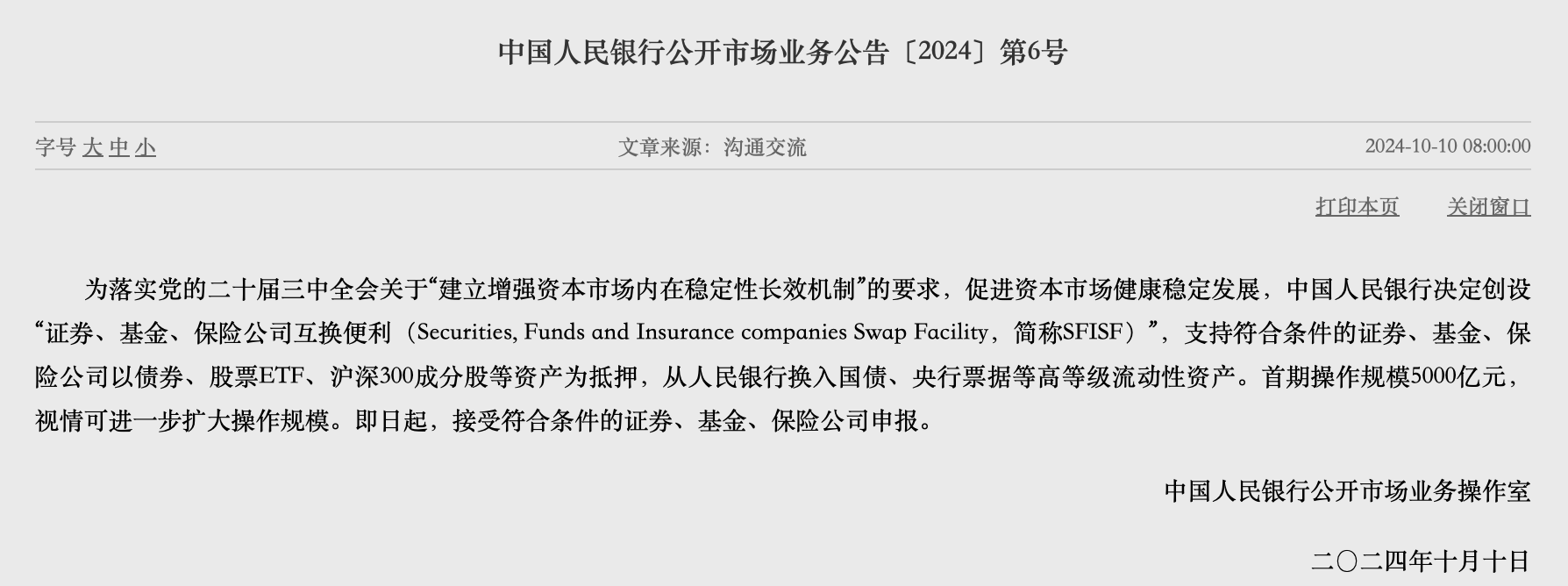 10月10日,中國人民銀行發(fā)布公告,為落實黨的二十屆三中全會關(guān)于“建立增強資本市場內(nèi)在穩(wěn)定性長效機制”的要求,促進資本市場健康穩(wěn)定發(fā)展,中國人民銀行決定創(chuàng)設“證券、基金、保險公司互換便利(Securities,F(xiàn)unds and Insurance companies Swap Facility,簡稱SFISF)”,支持符合條件的證券、基金、保險公司以債券、股票ETF、滬深300成分股等資產(chǎn)為抵押,從人民銀行換入國債、央行票據(jù)等高等級流動性資產(chǎn)。首期操作規(guī)模5000億元,視情可進一步擴大操作規(guī)模。即日起,接受符合條件的證券、基金、保險公司申報。