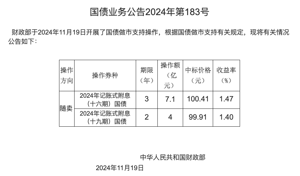 本報訊 (記者韓昱)財政部11月19日發(fā)布的《國債業(yè)務(wù)公告2024年第183號》顯示,財政部于2024年11月19日開展了國債做市支持操作,操作券種為2024年記賬式附息(十六期)國債、2024年記賬式附息(十九期)國債;期限分別為3年、2年;操作額分別為7.1億元、4億元;操作方向均為隨賣。
