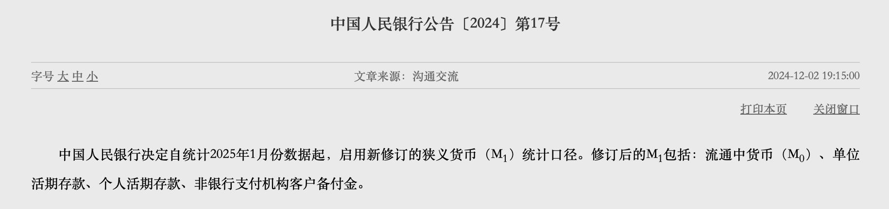 12月2日,中國(guó)人民銀行發(fā)布消息稱,中國(guó)人民銀行決定自統(tǒng)計(jì)2025年1月份數(shù)據(jù)起,啟用新修訂的狹義貨幣(M1)統(tǒng)計(jì)口徑。修訂后的M1包括:流通中貨幣(M0)、單位活期存款、個(gè)人活期存款、非銀行支付機(jī)構(gòu)客戶備付金。