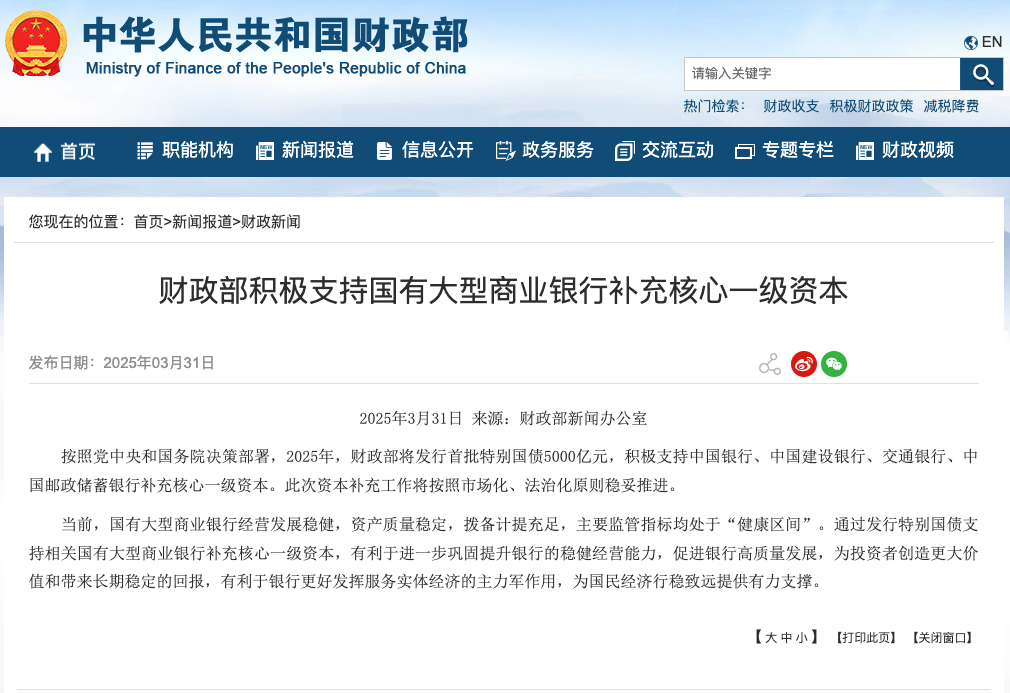 本報(bào)訊 (記者韓昱)據(jù)財(cái)政部網(wǎng)站3月31日消息,按照黨中央和國(guó)務(wù)院決策部署,2025年,財(cái)政部將發(fā)行首批特別國(guó)債5000億元,積極支持中國(guó)銀行、中國(guó)建設(shè)銀行、交通銀行、中國(guó)郵政儲(chǔ)蓄銀行補(bǔ)充核心一級(jí)資本。此次資本補(bǔ)充工作將按照市場(chǎng)化、法治化原則穩(wěn)妥推進(jìn)。