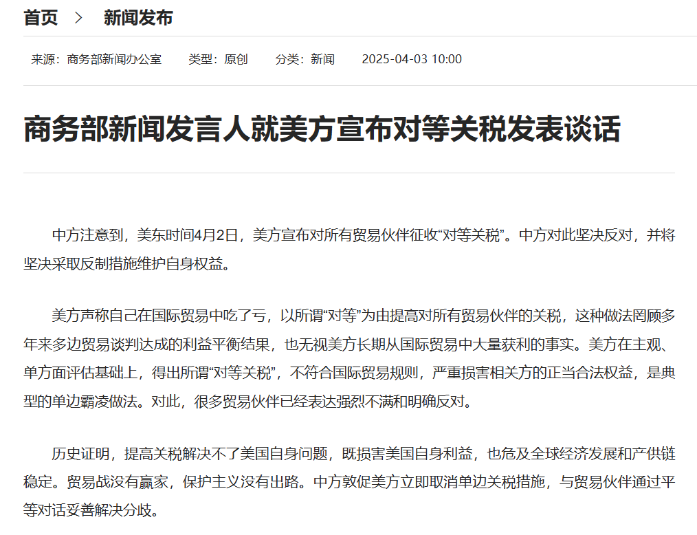 本報(bào)訊 (記者劉萌)4月3日,商務(wù)部新聞發(fā)言人就美方宣布對(duì)等關(guān)稅發(fā)表談話。