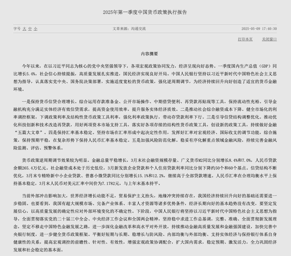 本報(bào)訊 (記者韓昱)5月9日,中國(guó)人民銀行發(fā)布《2025年第一季度中國(guó)貨幣政策執(zhí)行報(bào)告》(以下簡(jiǎn)稱《報(bào)告》),《報(bào)告》指出,當(dāng)前外部沖擊影響加大,世界經(jīng)濟(jì)增長(zhǎng)動(dòng)能不足,貿(mào)易保護(hù)主義抬頭,地緣沖突持續(xù)存在,我國(guó)經(jīng)濟(jì)持續(xù)回升向好的基礎(chǔ)還需要進(jìn)一步穩(wěn)固。也要看到,我國(guó)有超大規(guī)模市場(chǎng)、完備產(chǎn)業(yè)體系、豐富人才資源等諸多優(yōu)勢(shì)條件,經(jīng)濟(jì)長(zhǎng)期向好的基本趨勢(shì)沒有改變,要堅(jiān)定發(fā)展信心,以高質(zhì)量發(fā)展的確定性應(yīng)對(duì)外部環(huán)境變化的不確定性。