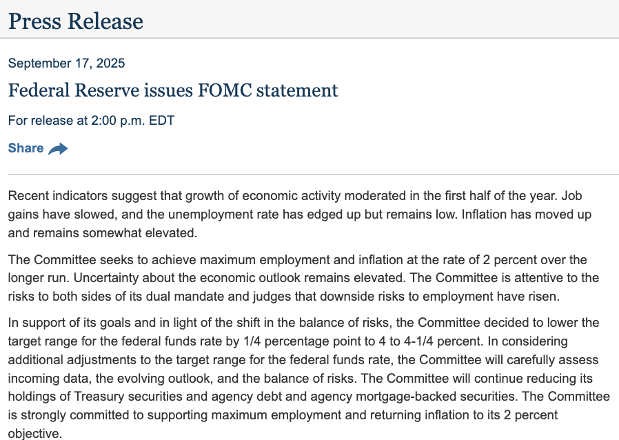 北京時間9月18日凌晨,美聯(lián)儲公布了9月份貨幣政策會議決議,宣布將聯(lián)邦基金利率目標區(qū)間下調25個基點到4.00%至4.25%之間,這是美聯(lián)儲自2024年12月份以來的首次降息。