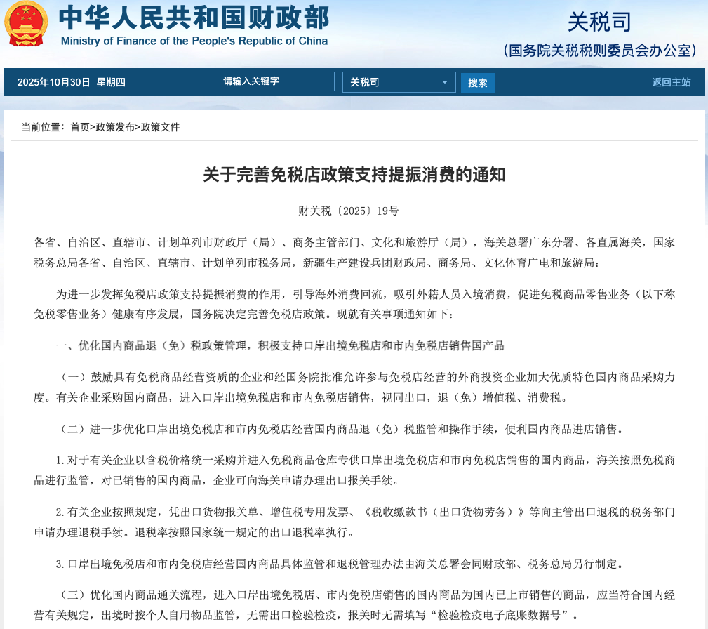 據(jù)財(cái)政部10月30日消息,近日,財(cái)政部、商務(wù)部、文化和旅游部、海關(guān)總署、稅務(wù)總局聯(lián)合印發(fā)《關(guān)于完善免稅店政策支持提振消費(fèi)的通知》(以下簡(jiǎn)稱《通知》),明確自2025年11月1日起完善免稅店政策,旨在進(jìn)一步發(fā)揮免稅店政策支持提振消費(fèi)的作用,引導(dǎo)海外消費(fèi)回流,吸引外籍人員入境消費(fèi),促進(jìn)免稅商品零售業(yè)務(wù)健康有序發(fā)展。