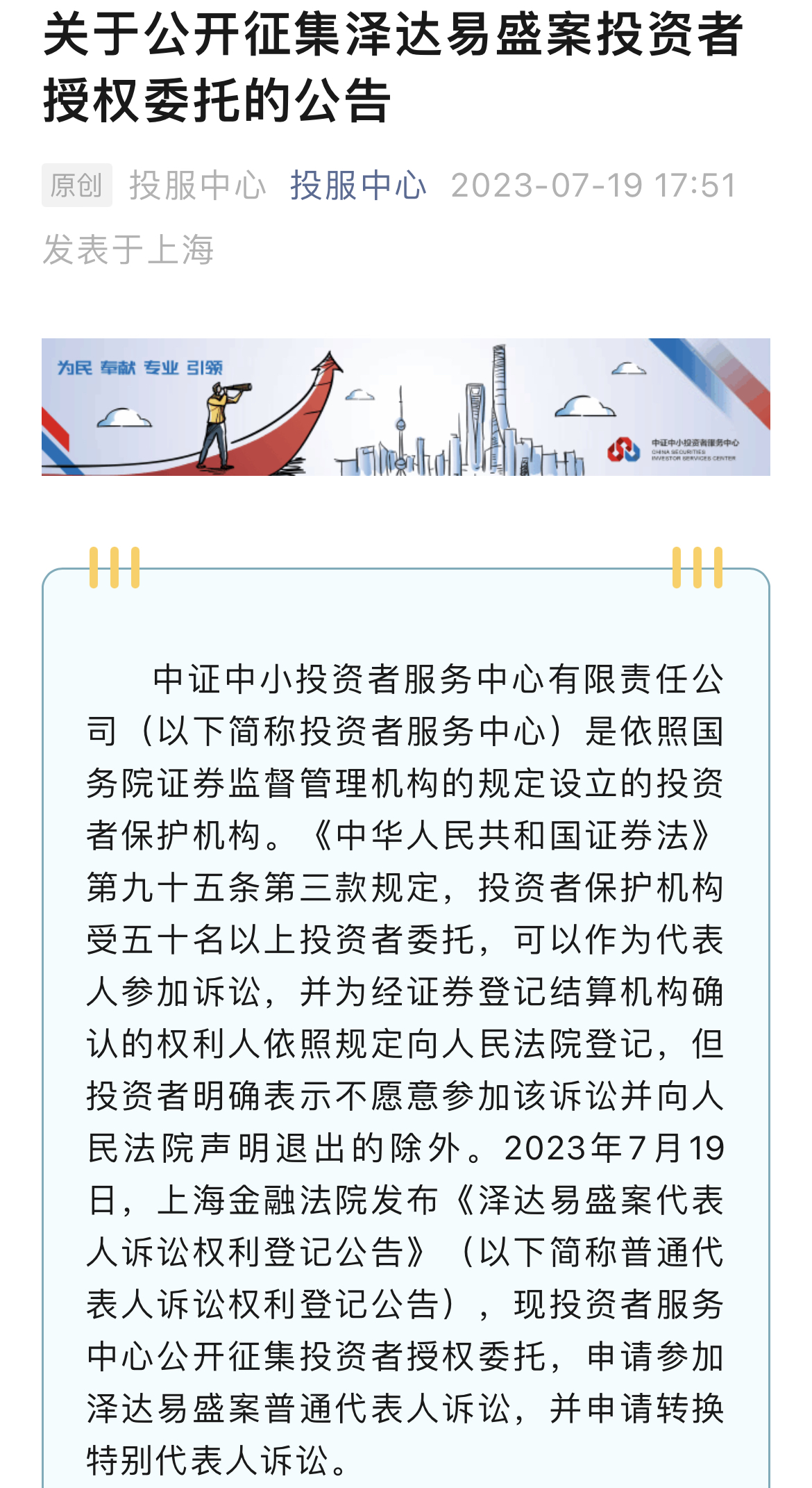 7月19日,在上海金融法院發(fā)布權(quán)利登記公告后,投服中心發(fā)布《關(guān)于公開征集澤達(dá)易盛案投資者授權(quán)委托的公告》,公開征集50名以上(含50名)投資者授權(quán)委托,申請(qǐng)參加澤達(dá)易盛案普通代表人訴訟,并申請(qǐng)轉(zhuǎn)換特別代表人訴訟。