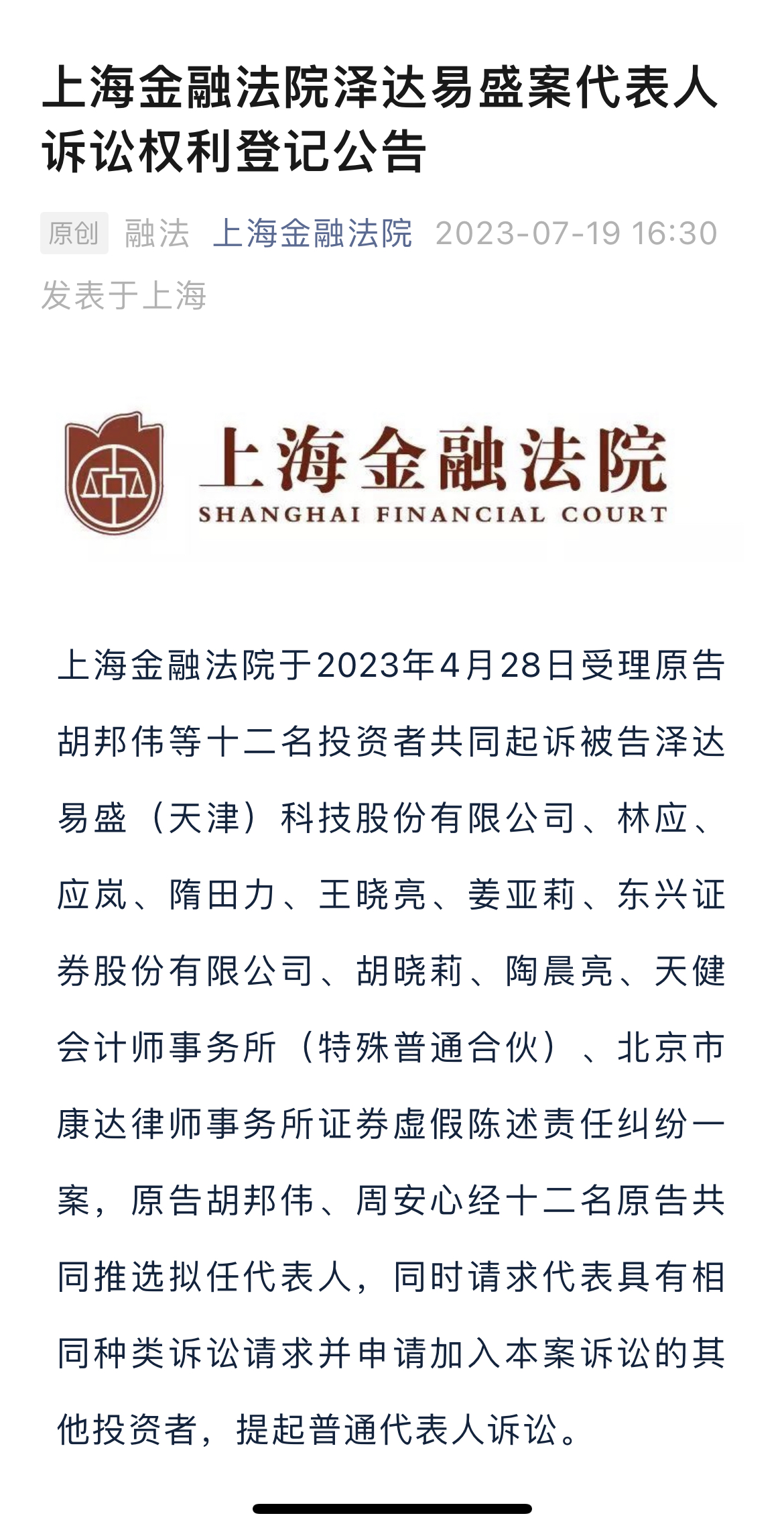 7月19日,上海金融法院發(fā)布《澤達(dá)易盛案代表人訴訟權(quán)利登記公告》。同日,投服中心公開征集50名以上(含50名)投資者授權(quán)委托,申請(qǐng)參加澤達(dá)易盛案普通代表人訴訟,并申請(qǐng)轉(zhuǎn)換特別代表人訴訟。