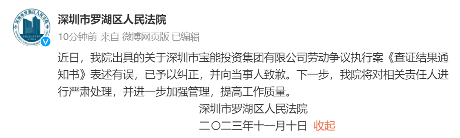 為此,《證券日報》記者聯(lián)系深圳市羅湖區(qū)人民法院進行求證,法院在11月10日下午回復記者并在微博公布,“近日,我院出具的關于深圳市寶能投資集團有限公司勞動爭議執(zhí)行案《查證結果通知書》表述有誤,已予以糾正,并向當事人致歉。下一步,我院將對相關責任人進行嚴肅處理,并進一步加強管理,提高工作質量。”