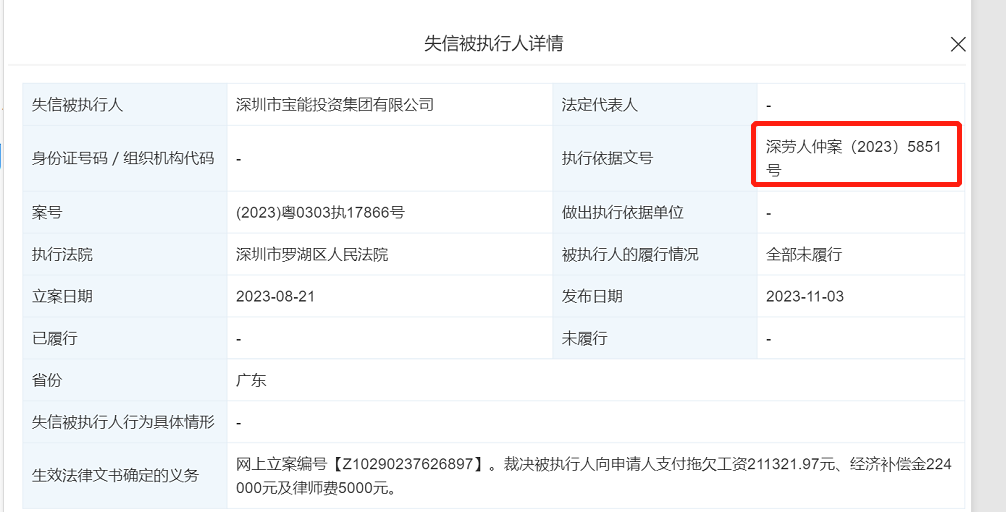 事情的緣由,在于寶能投資涉及一起勞動爭議案件,深圳市勞動人事爭議仲裁委員會深勞人仲案【2023】5851號仲裁裁決已經發(fā)生法律效力,由于被執(zhí)行人(寶能投資)沒有履行生效法律文書所確定的內容,申請執(zhí)行人向深圳市羅湖區(qū)人民法院申請強制執(zhí)行,深圳市羅湖區(qū)人民法院已依法受理。
