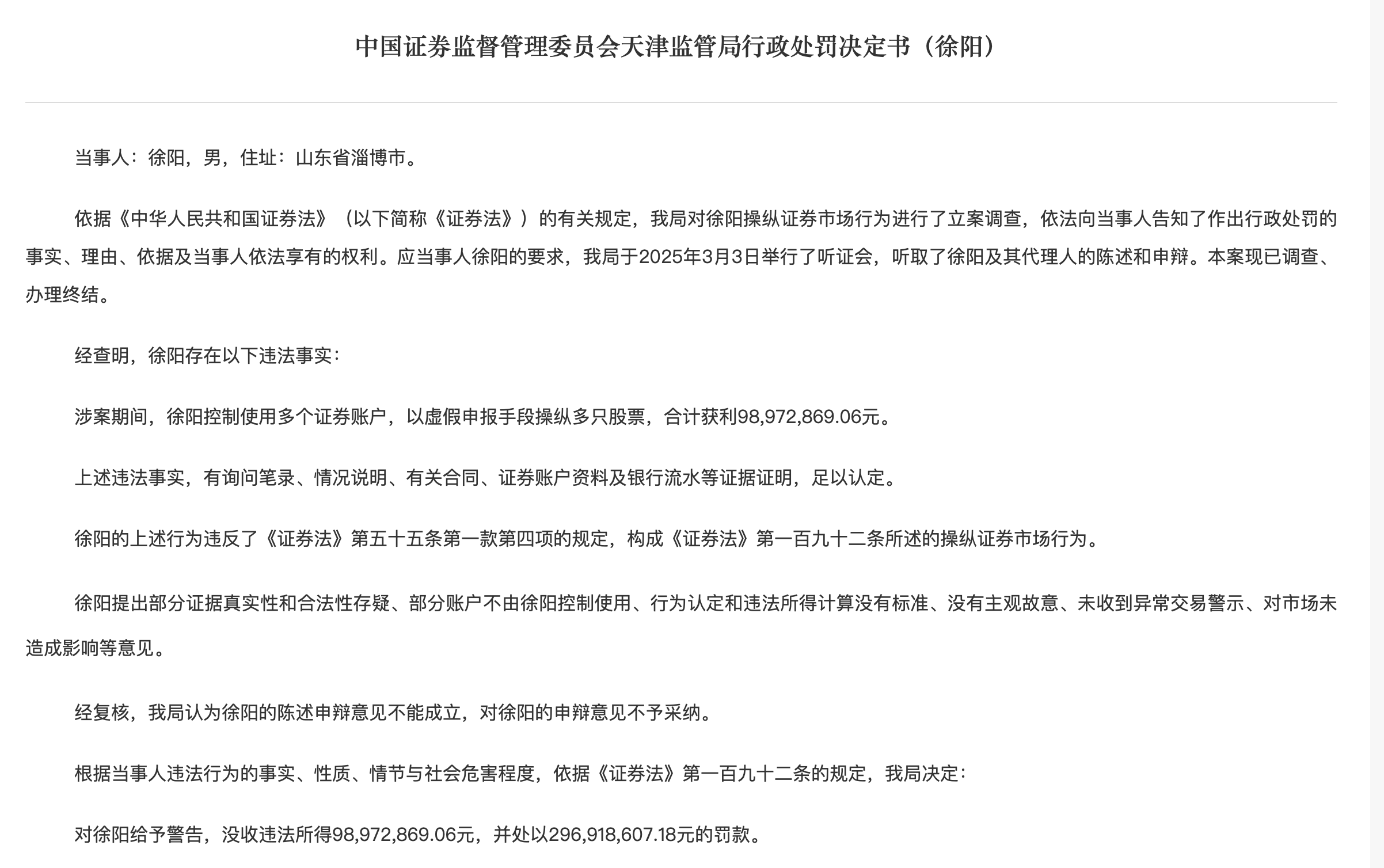天津證監(jiān)局表示,依據(jù)《中華人民共和國證券法》(以下簡稱《證券法》)的有關規(guī)定,天津證監(jiān)局對徐陽操縱證券市場行為進行了立案調(diào)查,依法向當事人告知了作出行政處罰的事實、理由、依據(jù)及當事人依法享有的權利。應當事人徐陽的要求,天津證監(jiān)局于2025年3月3日舉行了聽證會,聽取了徐陽及其代理人的陳述和申辯。本案現(xiàn)已調(diào)查、辦理終結(jié)。