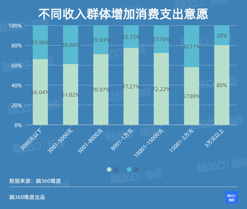 根據(jù)融360維度的調(diào)查結(jié)果,68.61%的人表示疫情結(jié)束后,短期內(nèi)有增加消費(fèi)支出的意愿。月收入在3萬元以上的受訪者增加短期消費(fèi)支出的意愿最高,比例達(dá)到80%。