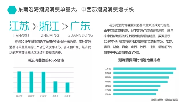 從地域看,經(jīng)濟(jì)較為發(fā)達(dá)的東南沿海區(qū)域訂單量最高,江蘇、浙江和廣東位列前三。線下潮流門店稀缺的中西部地區(qū)增速明顯。