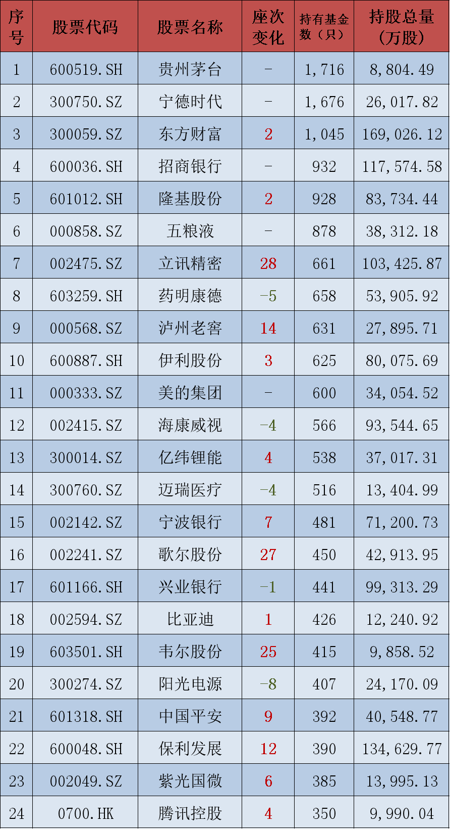 重倉(cāng)股座次變動(dòng)方面,數(shù)據(jù)顯示,相較于去年三季度末,立訊精密、瀘州老窖、伊利股份在四季度躋身公募基金前十大重倉(cāng)股座次,分別從第35位、第23位和第13位躍升至第7位、第9位和第10位。