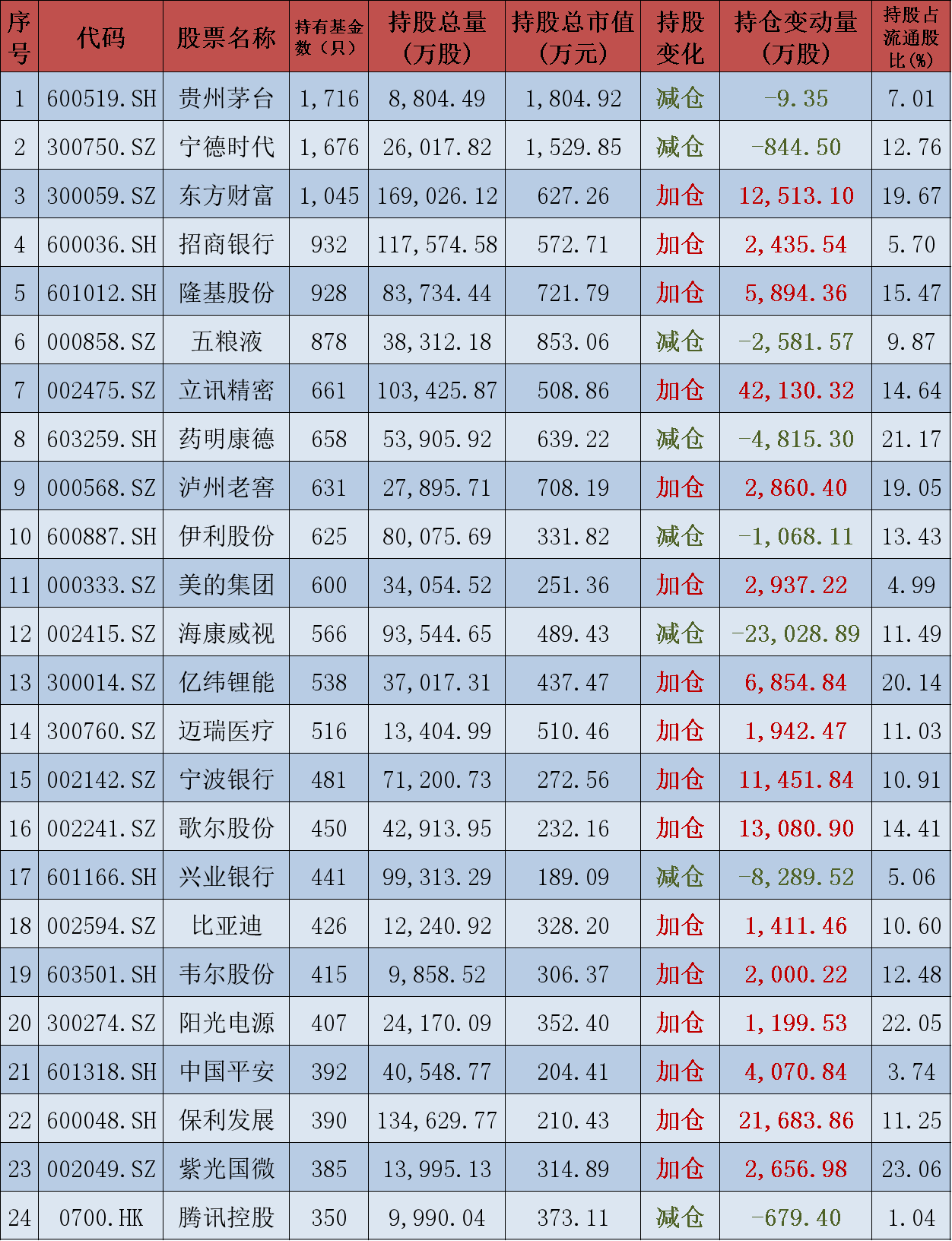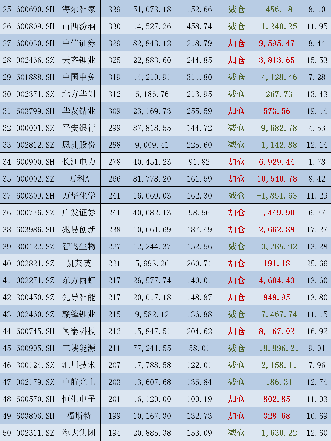公募基金2021年四季度前50名重倉(cāng)股持倉(cāng)變動(dòng)一覽: