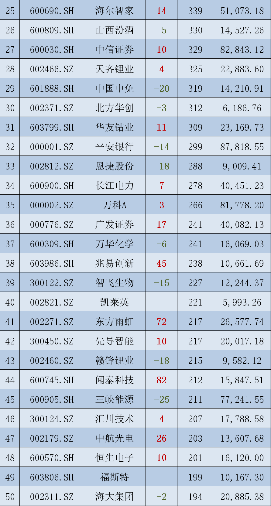 公募基金2021年四季度前50名重倉(cāng)股座次變動(dòng)一覽: