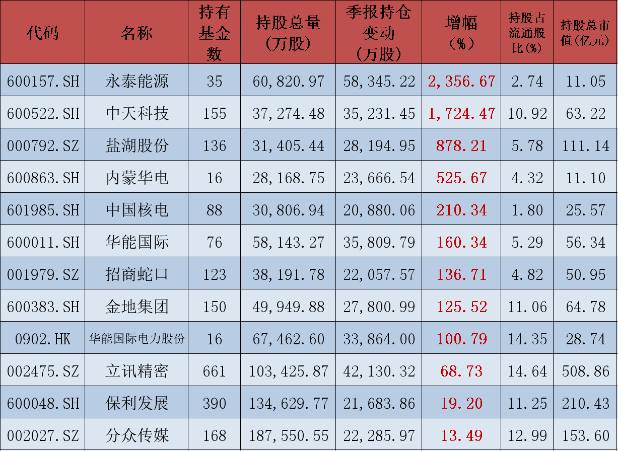 截至四季度末,煤炭板塊上市公司永泰能源獲公募基金重倉(cāng)持有6.02億股,較上一季度末增持5.83億股,基金增持動(dòng)作明顯;立訊精密作為公募基金的重倉(cāng)個(gè)股,四季度期間獲公募基金重倉(cāng)持有10.34億股,較上一季度末增持4.21億股;電力股華能國(guó)際、華能國(guó)際H股、內(nèi)蒙華電四季度期間分別獲公募基金重倉(cāng)持有5.81億股、6.75億股和2.82億股,較上一季度紛紛增持超2億股,分別為3.58億股、3.39億股和2.37億股。
