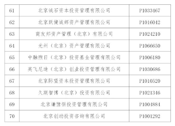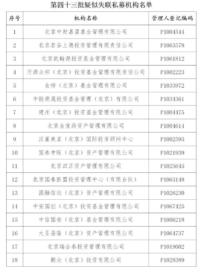 3月1日,中國(guó)證券投資基金業(yè)協(xié)會(huì)(以下簡(jiǎn)稱“中基協(xié)”)發(fā)布公告稱,近期,中基協(xié)在日常工作中發(fā)現(xiàn)70家疑似失聯(lián)私募機(jī)構(gòu)(附件),通過該70家私募機(jī)構(gòu)在資產(chǎn)管理業(yè)務(wù)綜合報(bào)送平臺(tái)(以下簡(jiǎn)稱AMBERS系統(tǒng))中登記的固定電話、手機(jī)號(hào)碼、電子郵件等聯(lián)系方式無法與其取得有效聯(lián)系。