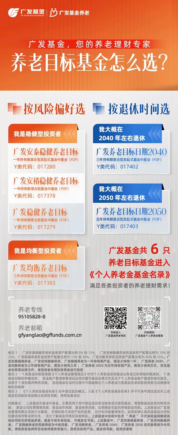 備注1:廣發(fā)安泰穩(wěn)健養(yǎng)老權(quán)益類資產(chǎn)配置比例0%到15%,廣發(fā)安裕穩(wěn)健養(yǎng)老權(quán)益類資產(chǎn)配置比例為10%到25%,廣發(fā)穩(wěn)健養(yǎng)老權(quán)益類資產(chǎn)配置比例為15%到30%,廣發(fā)均衡養(yǎng)老權(quán)益類資產(chǎn)配置比例為40%到55%。廣發(fā)安泰穩(wěn)健養(yǎng)老、廣發(fā)安裕穩(wěn)健養(yǎng)老、廣發(fā)穩(wěn)健養(yǎng)老為一年持有期產(chǎn)品,需至少持有一年;廣發(fā)養(yǎng)老2040、廣發(fā)均衡養(yǎng)老為三年持有期產(chǎn)品,需至少持有三年;廣發(fā)養(yǎng)老2050為五年持有期產(chǎn)品,需至少持有五年,詳見基金合同等法律文件,請(qǐng)投資者合理安排資金進(jìn)行投資。