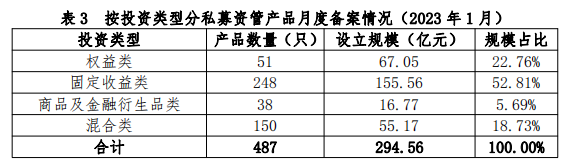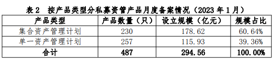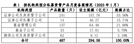 從私募資管產(chǎn)品備案情況來(lái)看,2023年1月份,證券期貨經(jīng)營(yíng)機(jī)構(gòu)當(dāng)月共備案私募資管產(chǎn)品487只,設(shè)立規(guī)模294.56億元。當(dāng)月新設(shè)產(chǎn)品平均備案核查時(shí)間為2.4個(gè)工作日。