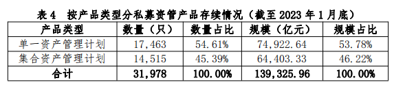 從私募資管產(chǎn)品存續(xù)情況來(lái)看,截至2023年1月底,證券期貨經(jīng)營(yíng)機(jī)構(gòu)私募資管業(yè)務(wù)規(guī)模合計(jì)13.93萬(wàn)億元(不含社?;?、企業(yè)年金),較上月底減少3754.94億元,下降2.62%。
