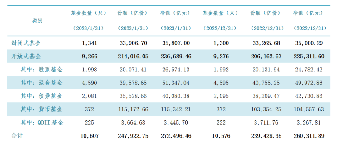 截至2023年1月底,我國(guó)境內(nèi)共有基金管理公司142家,其中,外商投資基金管理公司47家,內(nèi)資基金管理公司95家;取得公募基金管理資格的證券公司或證券公司資產(chǎn)管理子公司13家、保險(xiǎn)資產(chǎn)管理公司1家。以上機(jī)構(gòu)管理的公募基金資產(chǎn)凈值合計(jì)27.25萬(wàn)億元。