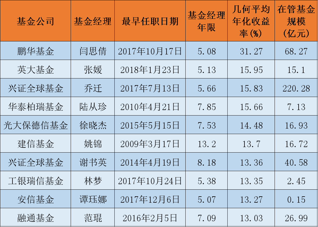 《證券日報》記者按照全市場基金管理年限超過五年、幾何平均年化收益率排名靠前的女性基金經理進行排名,以下為TOP10名單: