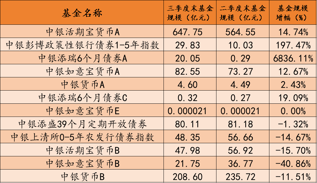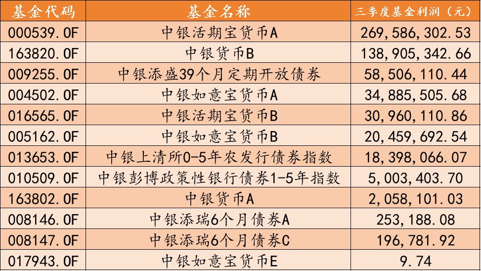 其中中銀活期寶貨幣市場基金A在三季度期間的基金利潤實現(xiàn)2.7億元,中銀貨幣市場證券投資基金B(yǎng)在三季度期間的基金利潤實現(xiàn)1.39億元。