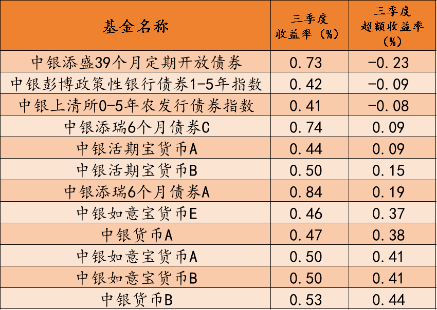 不過,也有中銀添盛39個月定期開放債券型證券投資基金、中銀榮享債券、中銀彭博政策性銀行債券1-5年指數(shù)證券投資基金、中銀上海清算所0-5年農(nóng)發(fā)行債券指數(shù)證券投資基金微幅跑輸同期業(yè)績比較基準(zhǔn),分別跑輸0.23個百分點、0.09個百分點和0.08個百分點。
