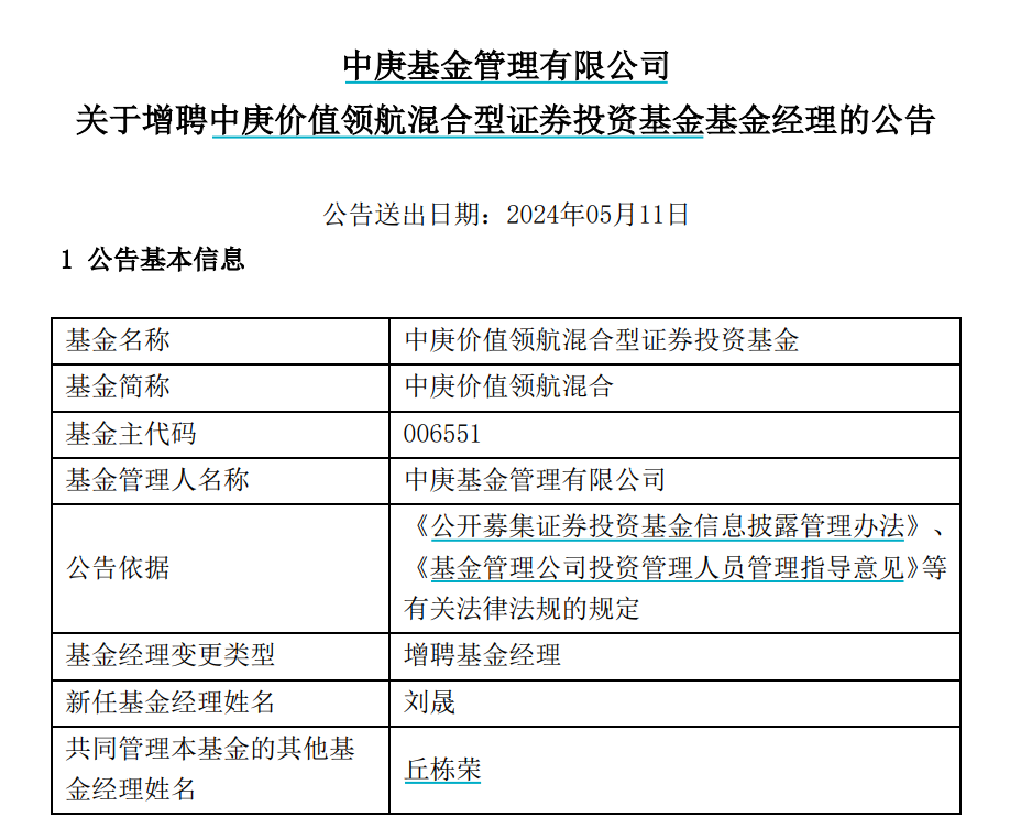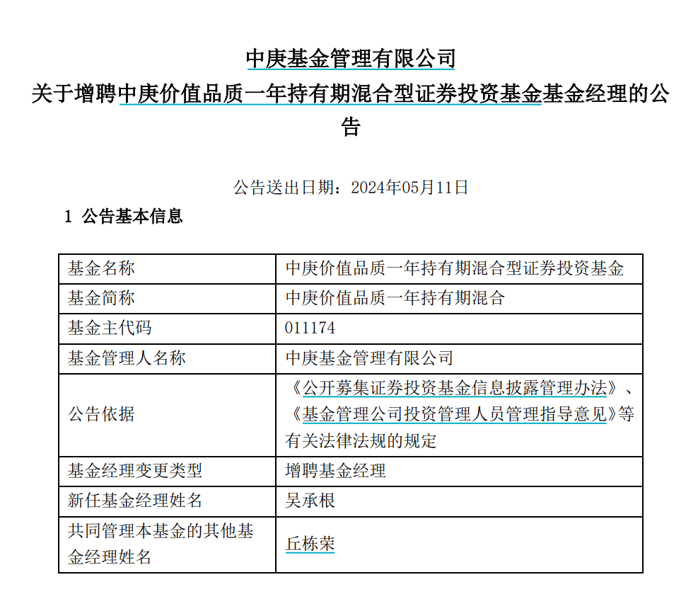 5月11日,中庚基金發(fā)布公告,公司基金經(jīng)理丘棟榮所管的兩只基金產(chǎn)品:中庚價(jià)值領(lǐng)航混合型證券投資基金、中庚價(jià)值品質(zhì)一年持有期混合型證券投資基金分別增聘劉晟、吳承根共同管理。