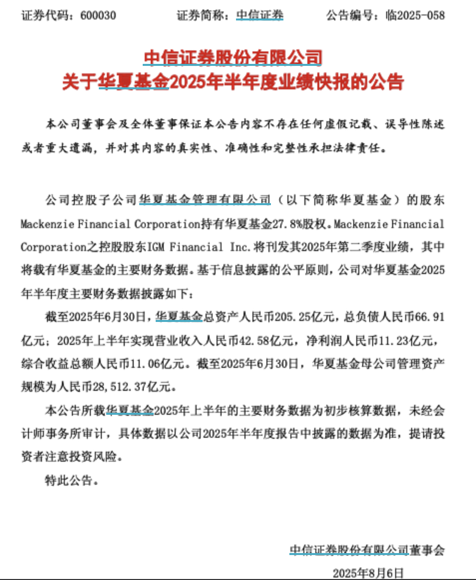 8月6日,中信證券發(fā)布華夏基金2025年半年度業(yè)績快報顯示,截至2025年6月30日,華夏基金總資產(chǎn)人民幣205.25億元,總負債人民幣66.91億元;2025年上半年實現(xiàn)營業(yè)收入人民幣42.58億元,凈利潤人民幣11.23億元,綜合收益總額人民幣11.06億元。截至2025年6月30日,華夏基金母公司管理資產(chǎn)規(guī)模為人民幣2.85萬億元。