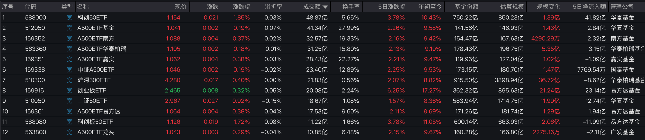 寬基ETF方面,多只產(chǎn)品交投活躍,成交額迅速放大。截至今日午間收盤,科創(chuàng)50ETF(588000)成交額達48.87億元。此外,還有A500ETF基金(512050)、滬深300ETF(510300)等11只寬基ETF成交額均超10億元。