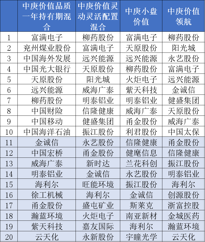 半年報(bào)顯示,中庚價(jià)值品質(zhì)一年持有期混合在上半年共計(jì)投資過135只個(gè)股(中庚價(jià)值靈動(dòng)靈活配置混合183只,中庚價(jià)值領(lǐng)航混合210只,中庚小盤價(jià)值235只)。除了二季報(bào)披露過的富滿電子、兗州煤業(yè)股份、中國海外發(fā)展、中國光大銀行、天原股份、遠(yuǎn)興能源、柳藥股份、中國財(cái)險(xiǎn)、中國移動(dòng)、中國海洋石油這前十大重倉股之外,第十一至第二十只重倉股分別為:金誠信、中國宏橋、威海廣泰、明泰鋁業(yè)、海利爾、徐工機(jī)械、甬金股份、瀚藍(lán)環(huán)境、紫天科技、云天化。