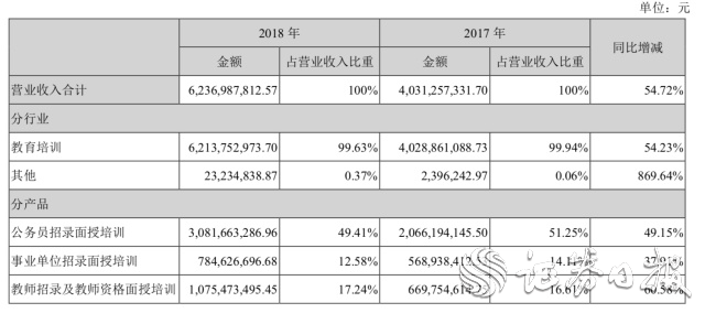 4月8日晚間,中公教育發(fā)布2018年年報(bào)。年報(bào)顯示,2018年公司營(yíng)收62.37億元,同比增長(zhǎng)54.72%;其中教育培訓(xùn)業(yè)務(wù)營(yíng)收62.14億元,占當(dāng)年?duì)I收99.63%,營(yíng)收同比增長(zhǎng)54.23%;以產(chǎn)品劃分,其公務(wù)員招錄面授培訓(xùn)占比最高,營(yíng)收30.82億元,占當(dāng)年?duì)I收49.41%,同比增長(zhǎng)49.15%。