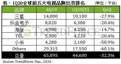 近日,市場研究機構TrendForce發(fā)布一季度全球電視出貨量數(shù)據(jù)(預估),小米出貨量同比下降超過50%,海信、三星等老牌電視企業(yè)在疫情影響下表現(xiàn)出更強的韌性,出貨量降幅多在20%左右,而電視行業(yè)也成呈現(xiàn)出回歸價值戰(zhàn)的趨勢。