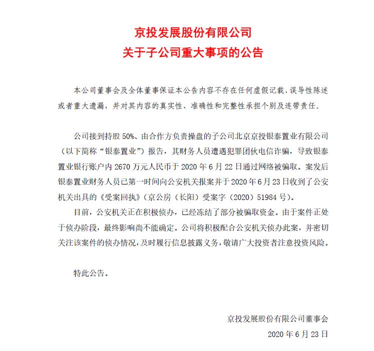 京投發(fā)展稱,目前,公安機(jī)關(guān)正在積極偵辦,已經(jīng)凍結(jié)了部分被騙取資金。由于案件正處于偵辦階段,最終影響尚不能確定。京投發(fā)展將積極配合公安機(jī)關(guān)偵辦此案,并密切關(guān)注該案件的偵辦情況。