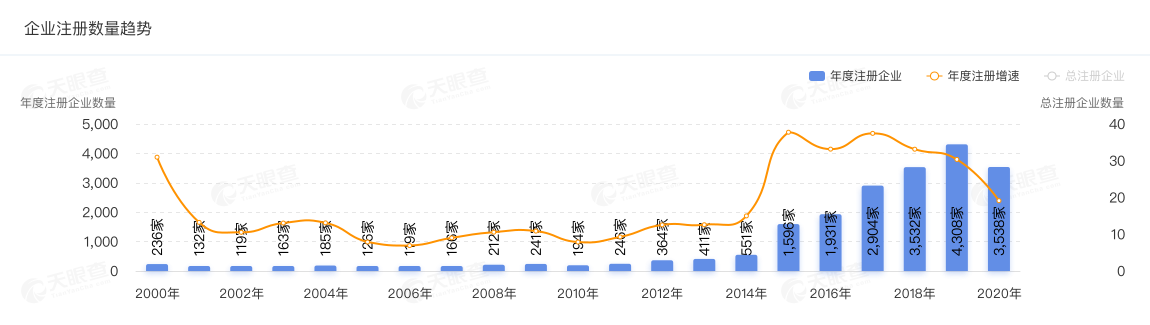 天眼查顯示釀酒類企業(yè)注冊數(shù)量呈現(xiàn)逐年走高趨勢(供圖:天眼查)