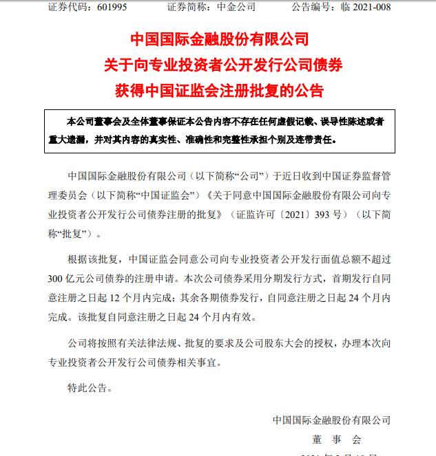 2月19日晚間,中金公司發(fā)布公告稱,于近日收到中國證監(jiān)會《關(guān)于同意中國國際金融股份有限公司向?qū)I(yè)投資者公開發(fā)行公司債券注冊的批復(fù)》(以下簡稱“批復(fù)”)。