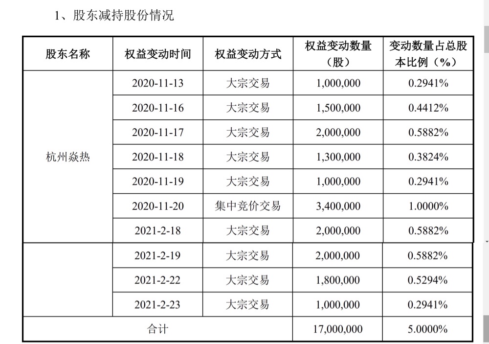 據(jù)悉,杭州焱熱因違約已多次遭被動減持。公告顯示,2020年11月13日至2021年2月23日,杭州焱熱因股票質(zhì)押違約被中泰證券通過大宗交易以及集中競價方式處置冀凱股份累計達10次。