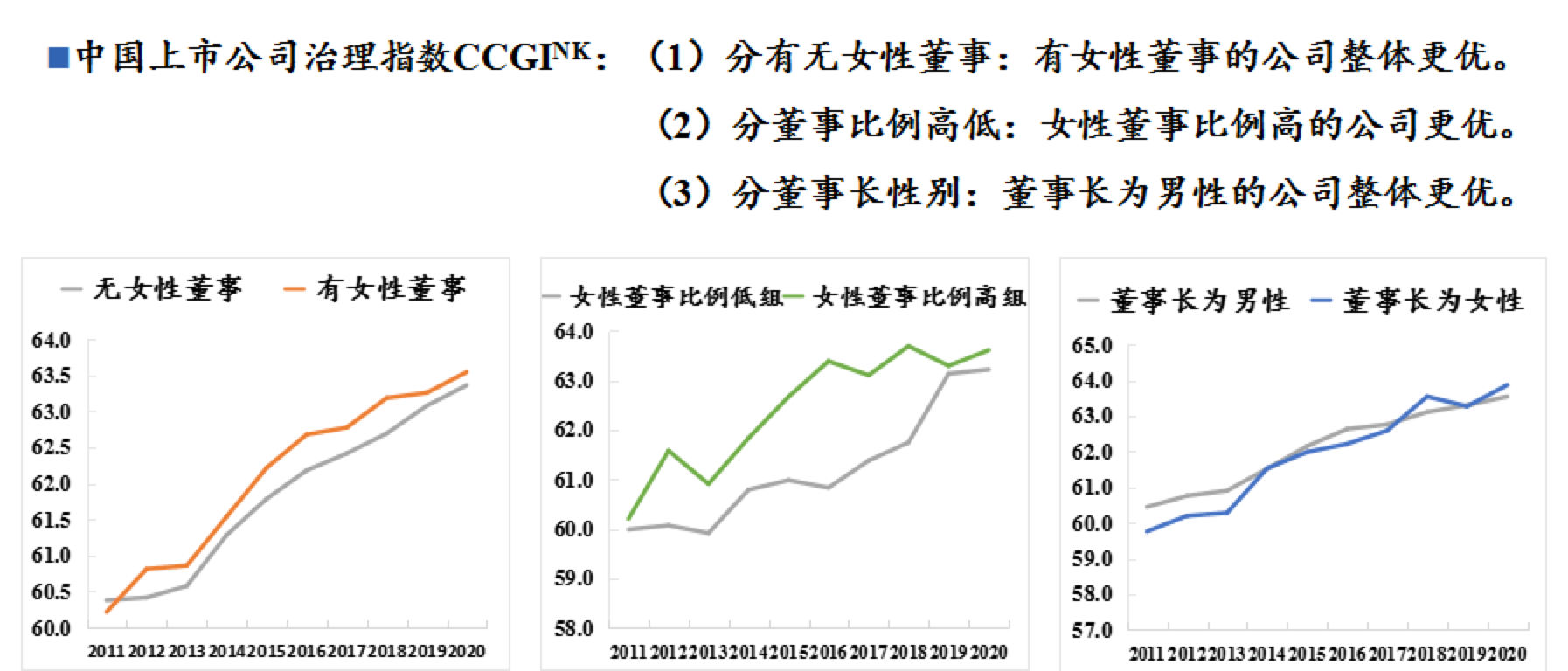 實際上,據(jù)前述《報告》,雖然在過去十年間女性董監(jiān)高的數(shù)量正不斷增加,目前,女性董事參與上市公司戰(zhàn)略決策的程度仍然較低。數(shù)據(jù)顯示,即便有72.77%的上市公司設(shè)置了女性董事,但其中50%以上的女性董事僅是獨立董事。《報告》中提到,有觀點認為,多元化可以提高董事會的決策水平,改善公司與投資者、外部團體及顧客的關(guān)系,甚至直接提高公司的績效等。而從中國上市公司治理指數(shù)來看,有女性董事及女性董事比例高的公司整體表現(xiàn)的確更勝一籌。