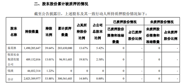 董事長秦英林質(zhì)押股份1.28億股