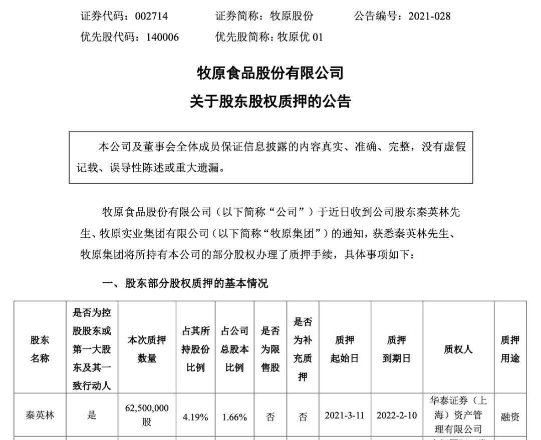 與此同時(shí),3月14日下午,牧原股份發(fā)布公告稱,公司股東秦英林于2021年3月11日質(zhì)押約1.28億股,占其所持股份比例為8.55%。公司股東牧原集團(tuán)于2021年3月11日質(zhì)押1900萬股,占其所持股份比例為3.89%。牧原股份的董事長、總經(jīng)理均是秦英林,男,56歲,中國國籍,無境外居留權(quán),本科學(xué)歷,畢業(yè)于河南農(nóng)業(yè)大學(xué)畜牧專業(yè),西湖大學(xué)創(chuàng)校校董會(huì)成員。