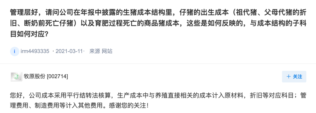 3月14日下午,牧原股份在互動(dòng)易平臺(tái)中表示,公司成本采用平行結(jié)轉(zhuǎn)法核算,生產(chǎn)成本中與養(yǎng)殖直接相關(guān)的成本計(jì)入原材料,折舊等對(duì)應(yīng)科目;管理費(fèi)用、制造費(fèi)用等計(jì)入其他費(fèi)用。